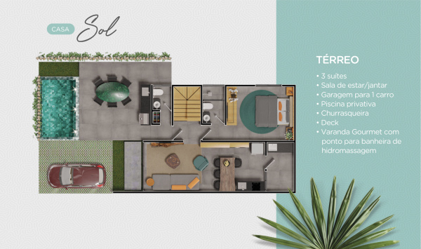 Térreo: 1 suíte, sala estar/jantar, garagem 2 carros, piscina privativa, deck, ponto para churrasqueira, dependência completa de empregados.